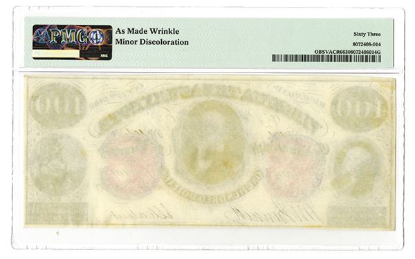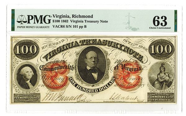 Richmond, VA. October 15, 1862, $100, VACR6, Issued obsolete banknote, Black on orange-red underprint protector, Washington on left, Native American woman on right and gentlemen in the middle, back blank, S/N 101, PMG graded Choice Uncirculated 63. Attractive high grade note. K&B, Columbia, SC.