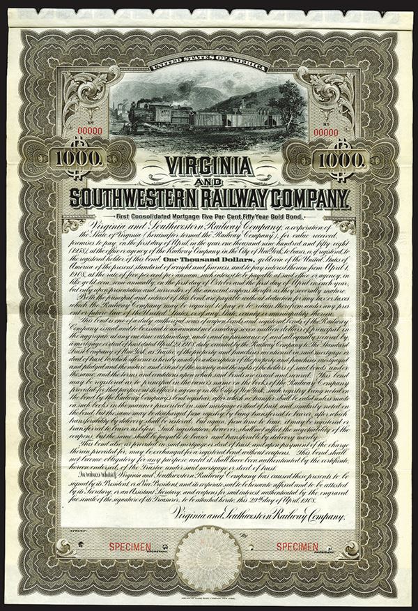 Virginia, $1000 Specimen Bond. Black on brown border and underprint, Coal train R-L passing factories in hills, Specimen overprints, POC's, VF-XF, ABNC. 4 found in ABN archives 12 years ago.