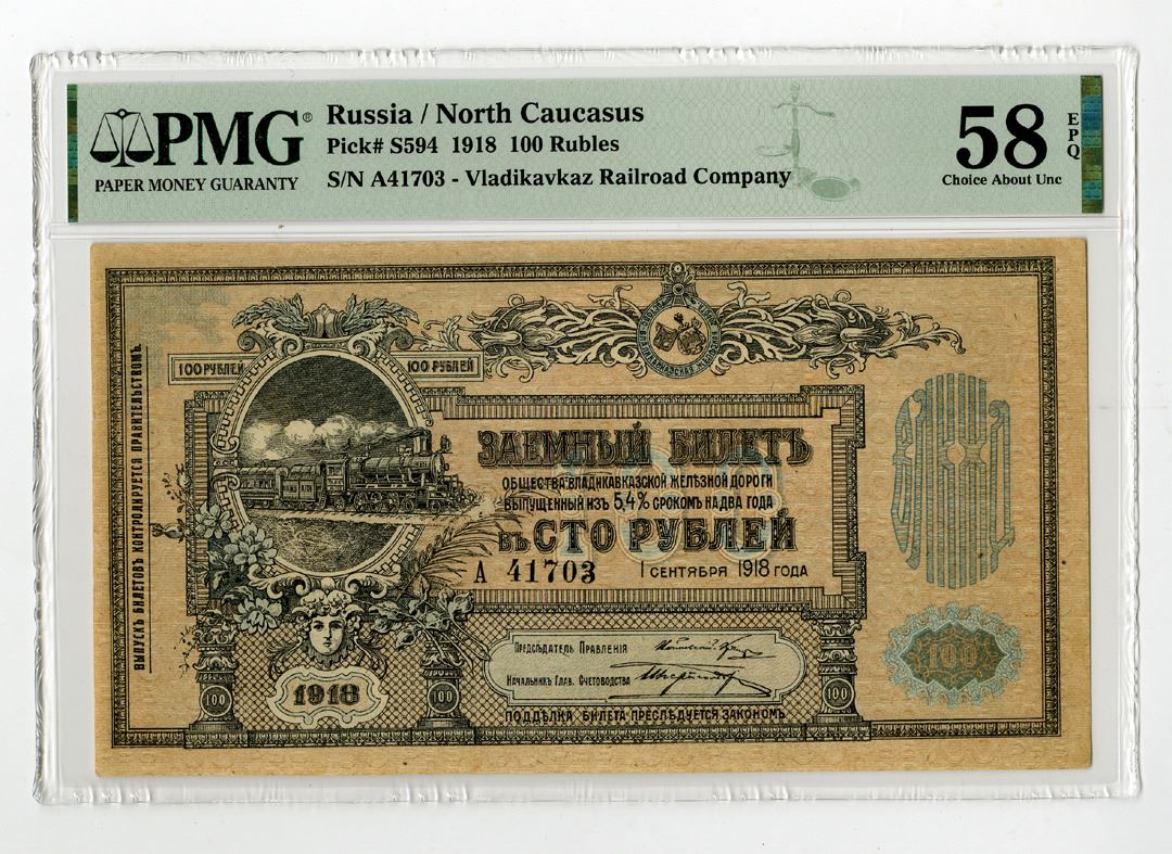 Russia, 1918, 100 Rubles, P-S594, Small train on the left of the face, map of the railroad route on back, S/N A41703, PMG graded Choice About Uncirculated 58 EPQ.