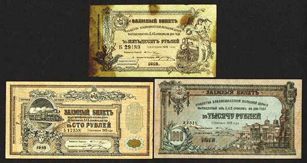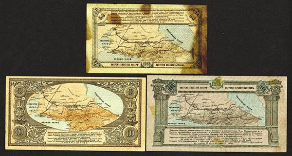 Russia, Lot of 3 notes, includes 50 Rubles, P-S593, VF with extreme staining; 100 Rubles, P-S594, Choice XF and 1000 Rubles, P-S596, XF with 2 small stamp hinges on back that can be removed. Attractive series with large maps on back.