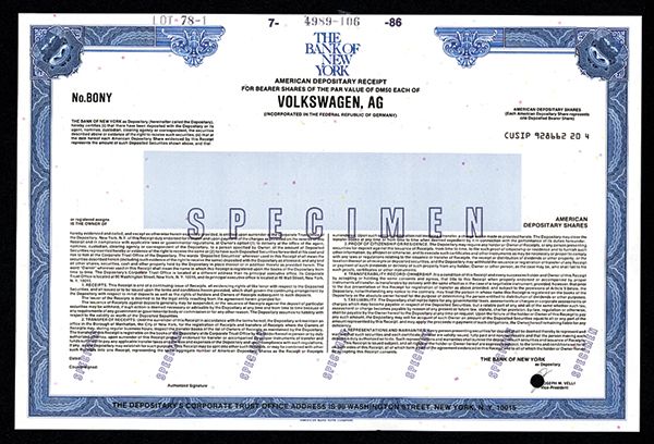 Volkswagen AG. Specimen ADR. Germany. ND (ca.1960-70's). ADR Shares, Includes Bank of New York as Depositary in blue. Specimen. XF, ABNC.
