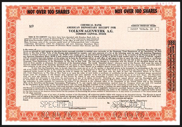 New York (Germany). 1976. Chemical Bank American Depositary Specimen Shares for Volkswagenwerk, Red border. EF, SBN.