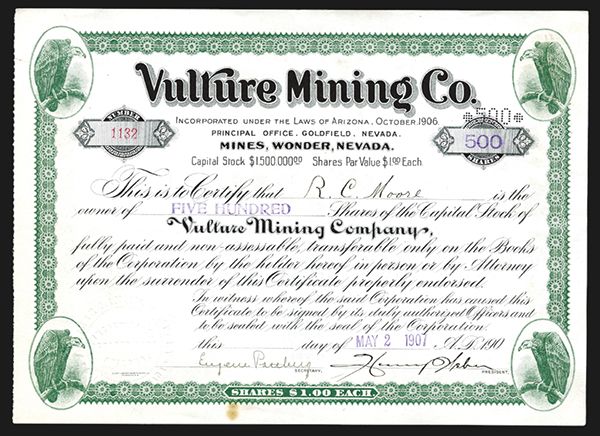 Vulture Mining Company, 1907 Issued Stock Certificate. Wonder, Nevada. 500 Shares, I/U, Black with green border with vultures, XF, rare mine and unique vignette.