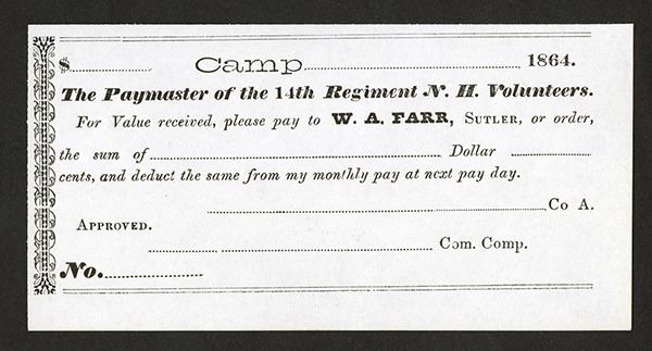 New Hampshire, $-odd, Unissued Sutler Scrip, Uncirculated.