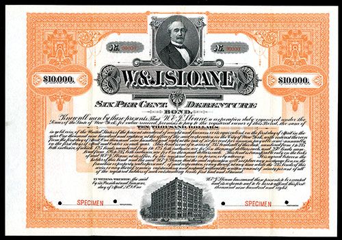 New York, 1908, $10,000 6% Registered Bond. The company catered to the wealthy. Founded as a rug importer and seller in 1843, it was the first company to import oriental carpets into the U.S. In 1891, W. & J. Sloane incorporated and set the national decorating taste of the U.S. Over the next sixty years, it was known for decorating the homes of the most prominent people in the country, including the Breakers and the White House, as well as creating Hollywood movie sets, and interiors of automobiles. It opened a branch in San Francisco to furnish pavilions at the 1915 Panama-Pacific Exposition and it also furnished the model homes at the 1939 New York World's Fair. Extremely rare and attractive bond.