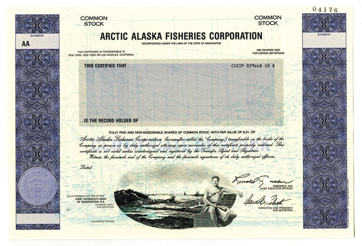 WA. Arctic Alaska Fisheries Corp., 1990s Odd Shrs Specimen Stock Cert., VF. Arctic Alaska Fisheries Corporation was incorporated in Washington in 1937 and operated a seafood products company whose vessels operated in the US exclusive economic zone off Alaska, Oregon and California, harvesting and processing bottom fish and crab at sea.