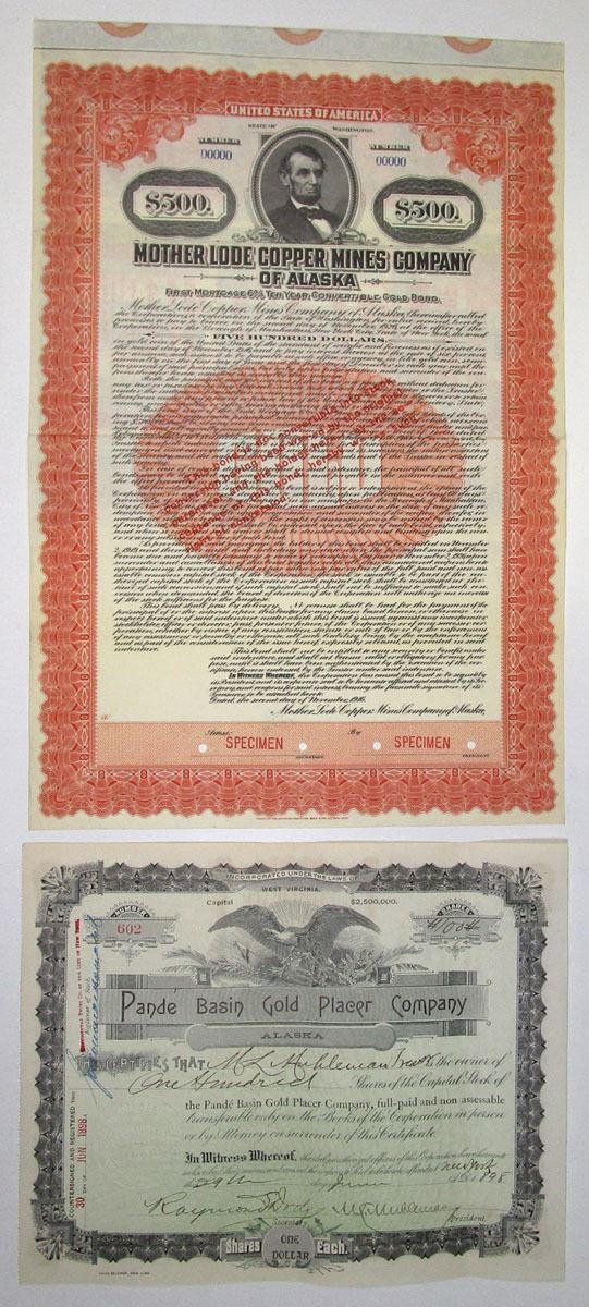 Washington & West Virginia, 1898 and 1916. Lot of 2 Certificates, Includes: 1898, Pande Basin Gold Placer Co., 100 Shares I/U Capital Stock Cert., S/N 602; 1916, Mother Lode Copper Mines Co. of Alaska $500 Specimen 6% Coupon Bond. Both are in Fine to VF condition. (2). Sold "AS IS" no returns accepted.