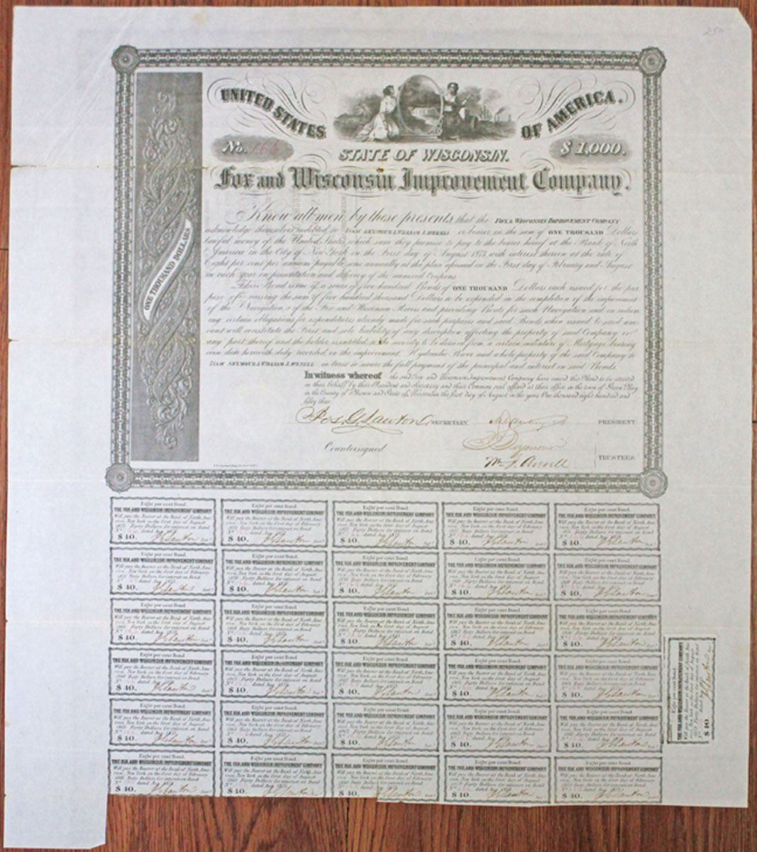 Wisconsin, 1853. $1000 I/U 8% First Mortgage Coupon Bond #166, Black text with black border printed on blue paper, Pair of allegorical women flank scene in oval frame at top. VF condition. The Fox and Wisconsin Improvement Company was incorporated for the improvement of the Fox River waterway and canal.