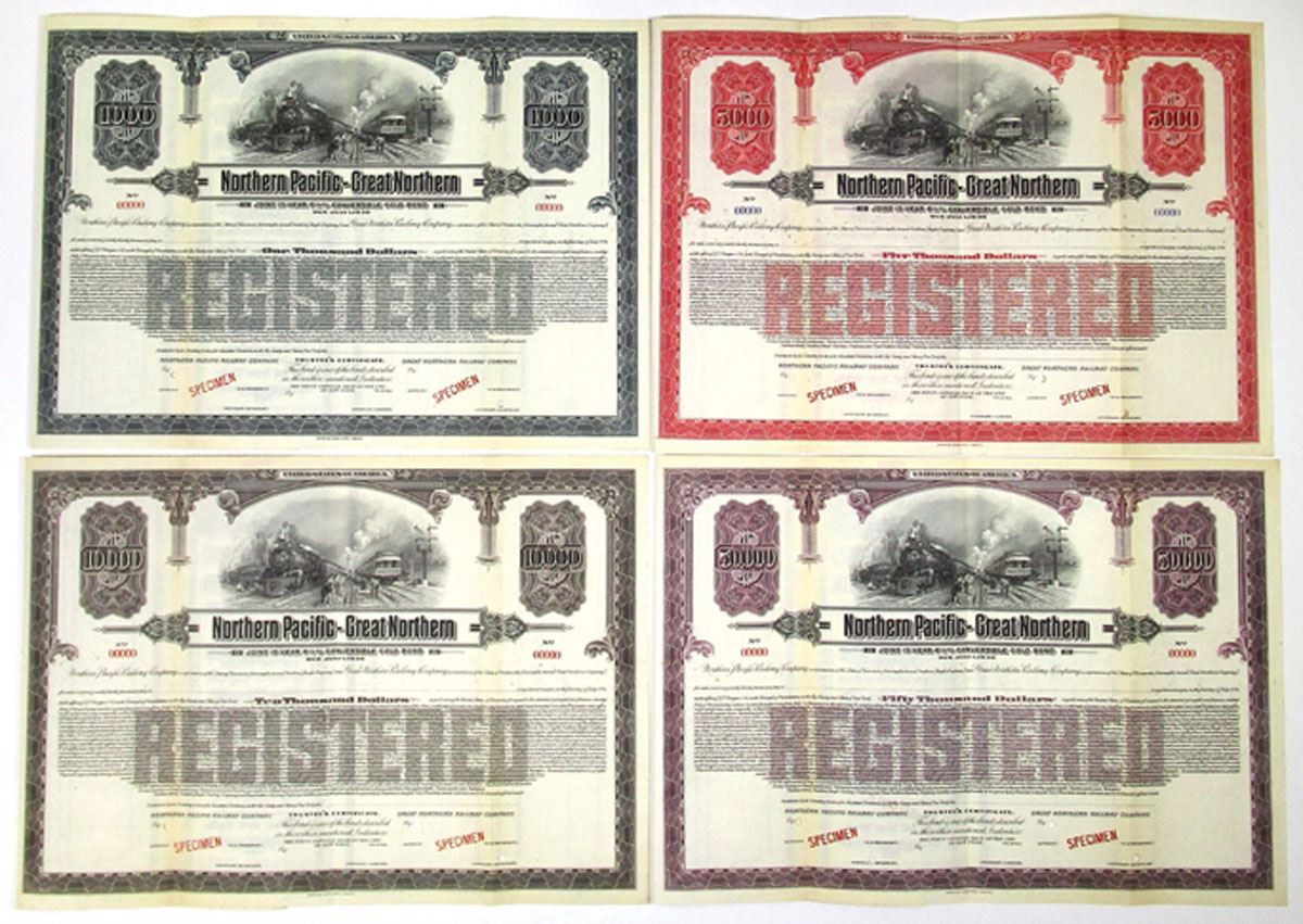 Wisconsin and Minnesota, 1921, Lot of 4 Specimen Bonds, Includes: $1000 Registered 6 1/2% Joint 15 Year Convertible Gold Bond, Black with steel gray border; $5000 Registered 6 1/2% Joint 15 Year Convertible Gold Bond, Black with red border; $10,000 Registered 6 1/2% Joint 15 Year Convertible Gold Bond, Black with dark brown border; $50,000 Registered 6 1/2% Joint 15 Year Convertible Gold Bond, Black with purple border. All have same vignette of trains passing men working on track at top center, Specimen overprints, POCs, are in VF to XF condition, printed by ABNC. (4). All are known as specimens only, no issued bonds known, the $50,000 denomination is rare.