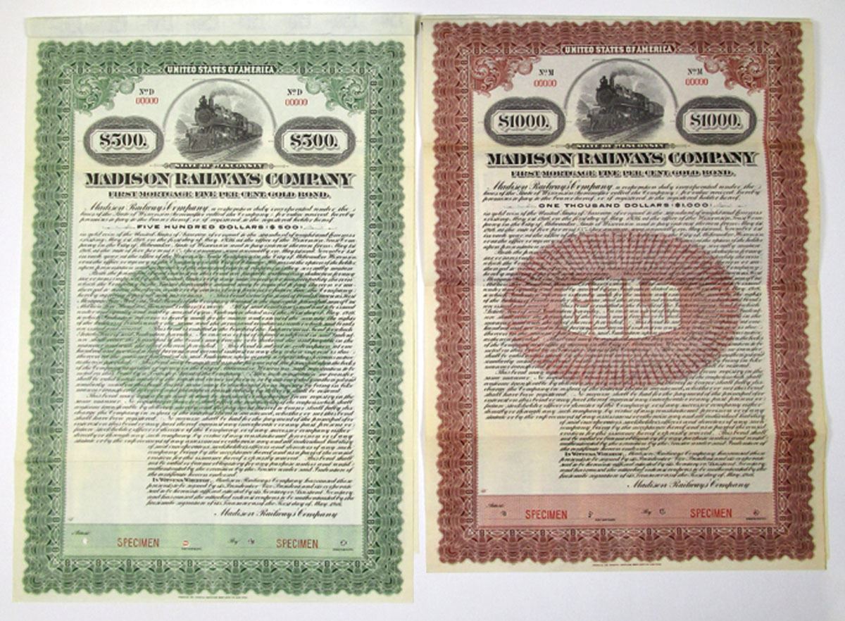 Wisconsin, 1916, Lot of 2 Specimen Bonds, Includes: $500 5% First Mortgage Gold Coupon Bond, Black with green border; $1000 5% First Mortgage Gold Coupon Bond, Black with brown border. Both have train in 3/4 profile in circular frame above title, Specimen overprints, POCs, are in XF to AU condition, and printed by Franklin Lee - ABNC. Attractive railroad bond pair, only known as specimens, no issued examples are known..