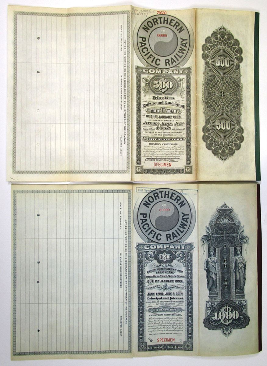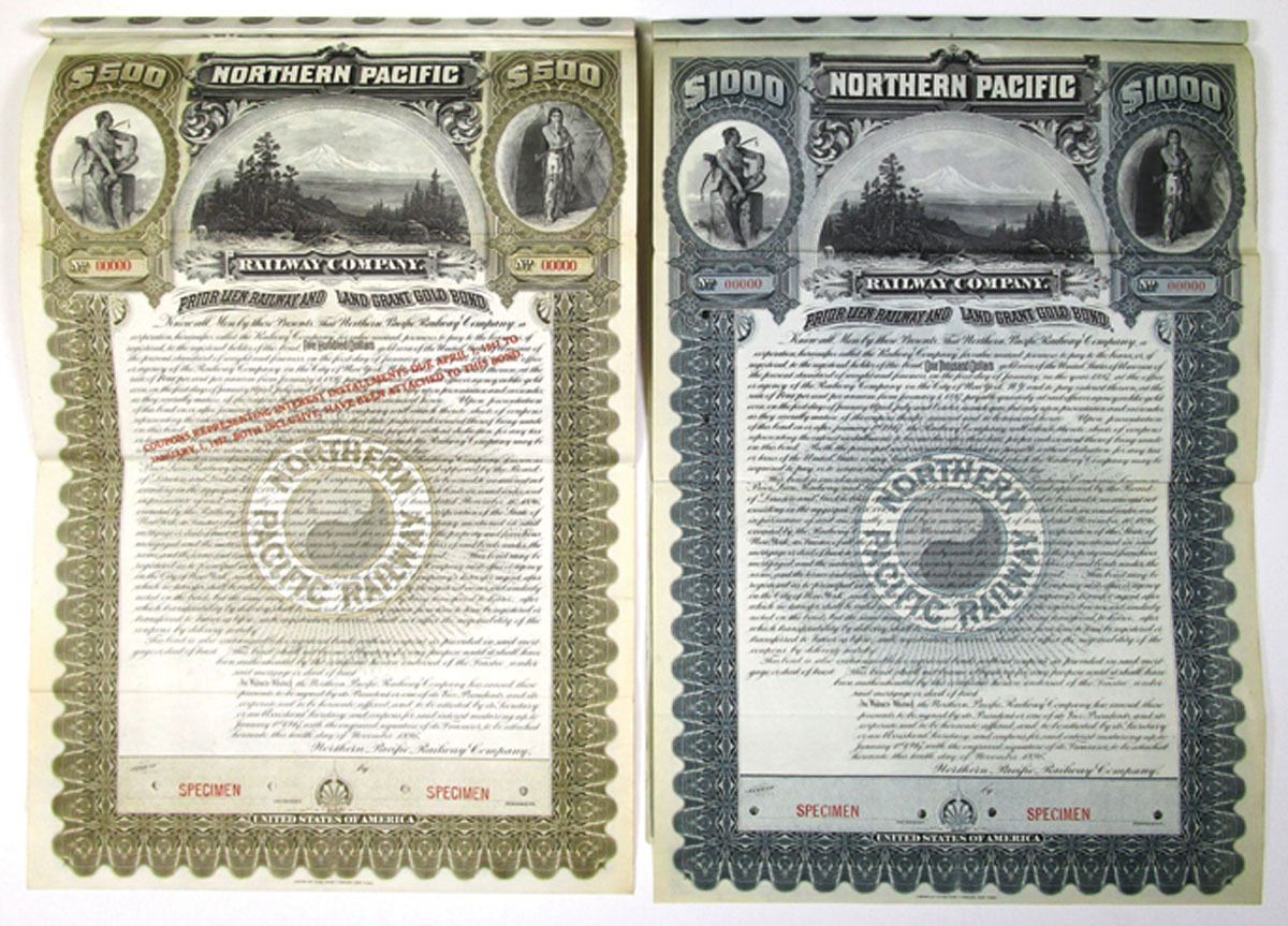 Wisconsin, 1896. Lot of 2 Specimen Bonds from the Northern Pacific Railway Co., both are 4% Prior Lien Railway and Land Grant Gold Coupon Bond: $500 in olive; and $1000 in blue. Both have red specimen overprints, 00000 serial numbers, and POCs. VF condition. ABNC. (2)