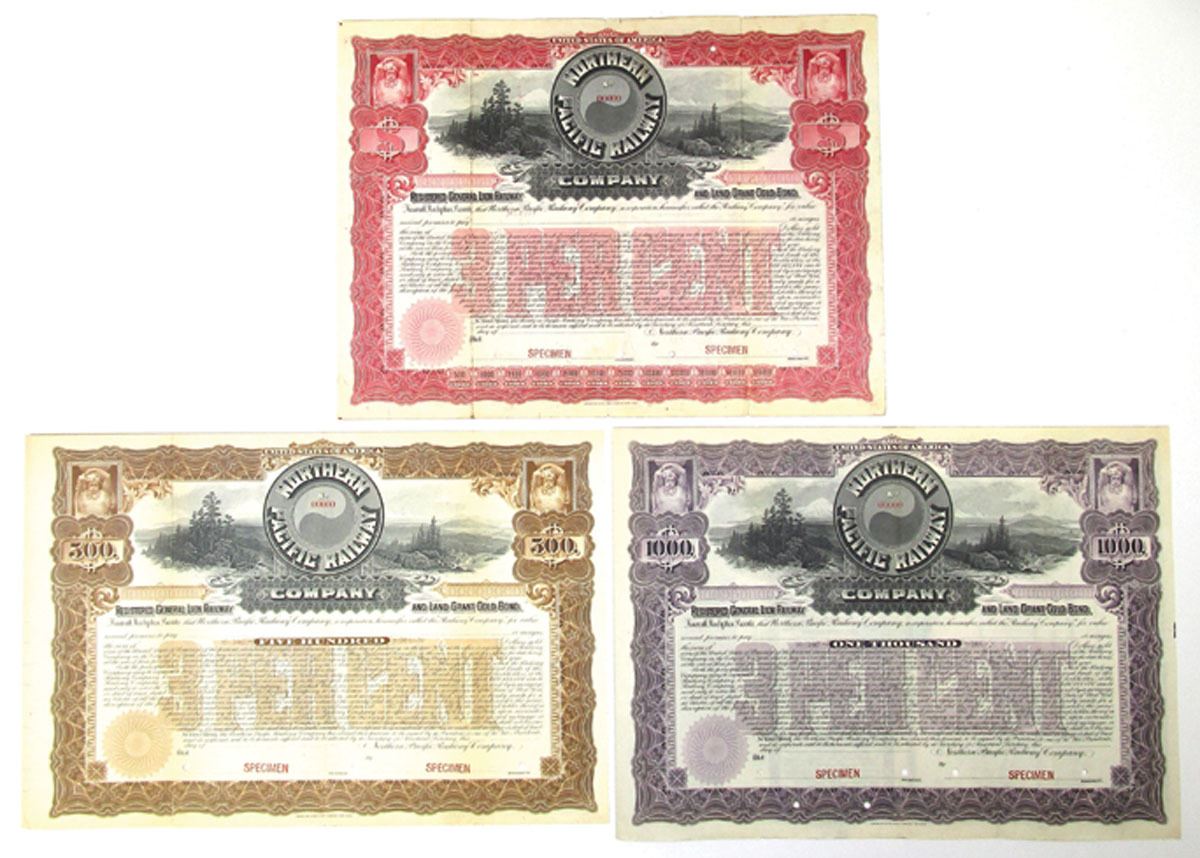 Wisconsin, 1896, Lot of 3 Specimen Registered Bonds, Includes: $-Odd Registered 3% General Lien Railway and Land Grant Gold Bond, Black with red border; $500 Registered 3% General Lien Railway and Land Grant Gold Bond, Black with brown border; $1000 Registered 3% General Lien Railway and Land Grant Gold Bond, Black with purple border. All have same vignette of landscape with Mt. Hood in background with circular logo between, Specimen overprints, POCs, are in VF to VF+ condition, and printed by ABNC. (3). Sold "AS IS" no returns accepted.