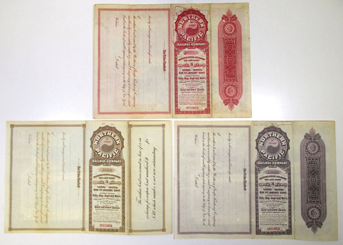 Wisconsin, 1896, Lot of 3 Specimen Registered Bonds, Includes: $-Odd Registered 3% General Lien Railway and Land Grant Gold Bond, Black with red border; $500 Registered 3% General Lien Railway and Land Grant Gold Bond, Black with brown border; $1000 Registered 3% General Lien Railway and Land Grant Gold Bond, Black with purple border. All have same vignette of landscape with Mt. Hood in background with circular logo between, Specimen overprints, POCs, are in VF to VF+ condition, and printed by ABNC. (3). Sold "AS IS" no returns accepted.