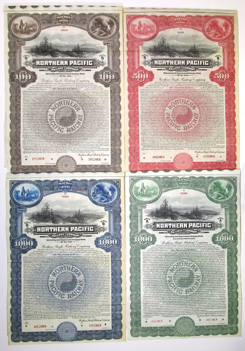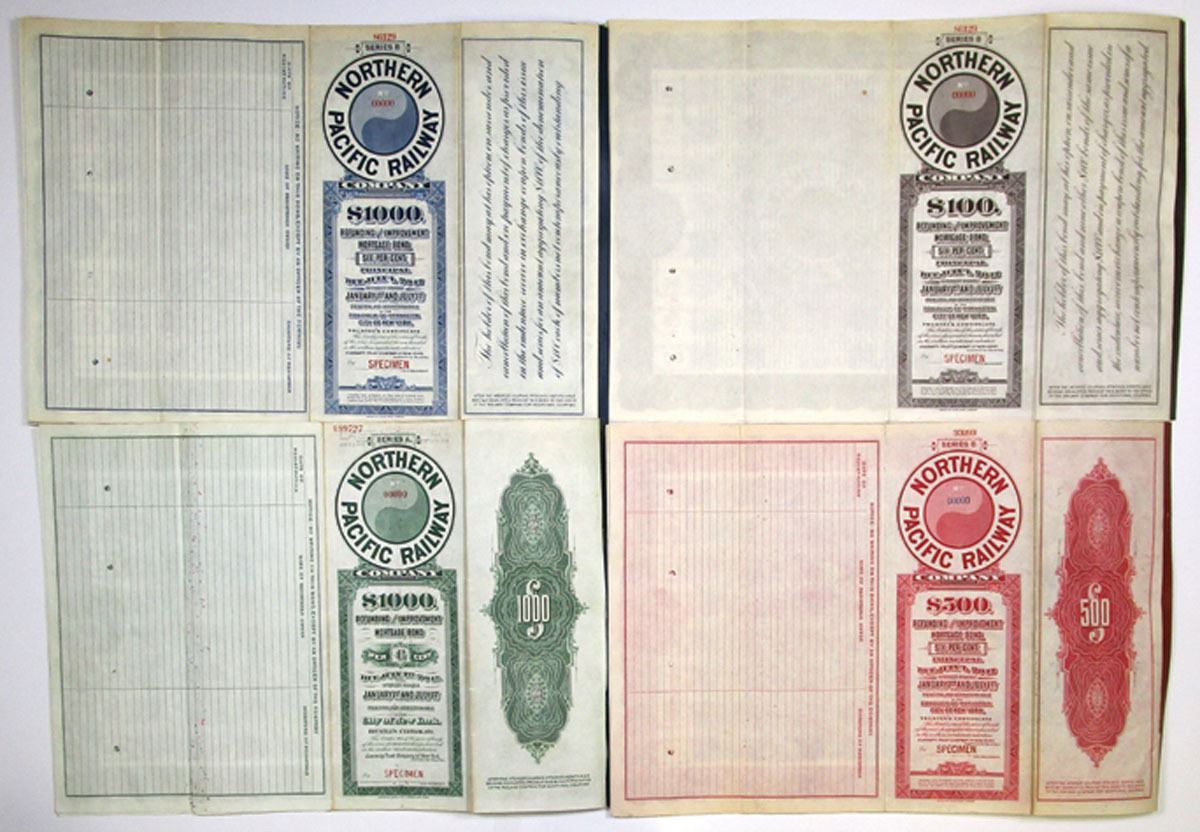 Wisconsin, 1914-21. Lot of 4 Specimen Bonds from the Northern Pacific Railway Co., all are Refunding and Improvement Mortgage Coupon Bonds, including: 1921, $100 6% Series B in brown; 1921, $500 6% Series B in red; 1921, $1000 6% Series B in blue; and, 1914, $1000 4.5% Series A in green. All have specimen overprints, 00000 serial numbers, and POCs. All are Rare in Cox. VF condition, ABNC. (4)