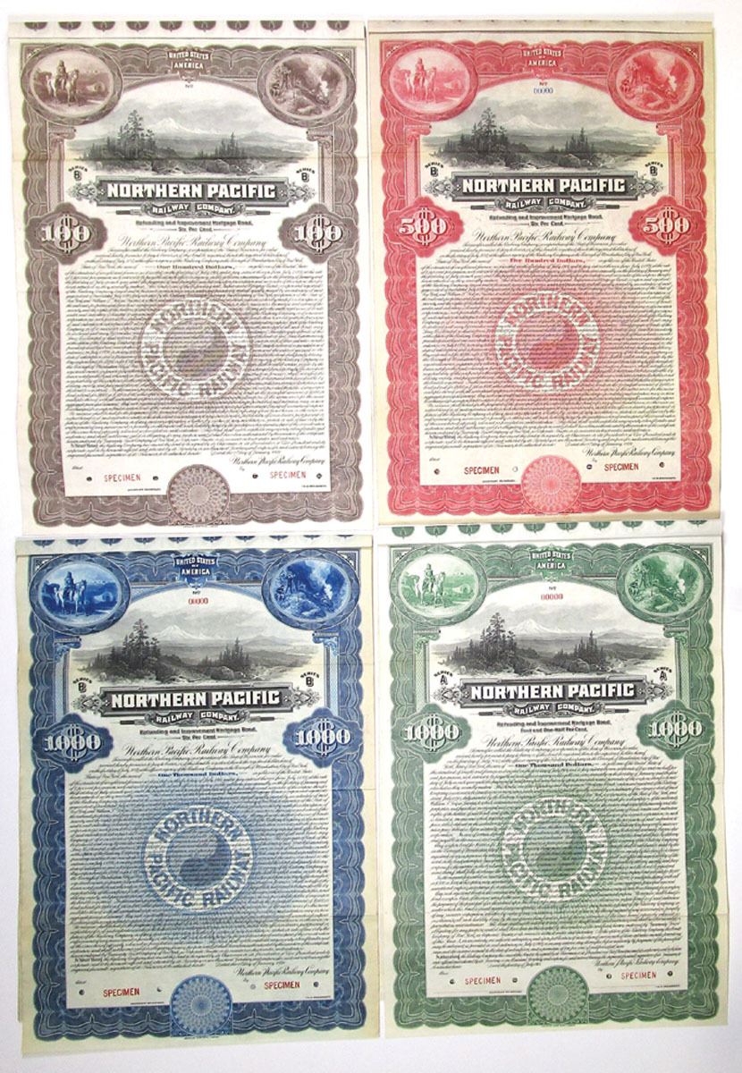 Wisconsin, 1914-21. Lot of 4 Specimen Bonds from the Northern Pacific Railway Co., all are Refunding and Improvement Mortgage Coupon Bonds, including: $100 6% Series B in brown; $500 6% Series B in red; $1000 6% Series B in blue; and $1000 4.5% Series A in green. All have specimen overprints, 00000 serial numbers, and POCs. All are Rare in Cox. VF condition, ABNC. (4)