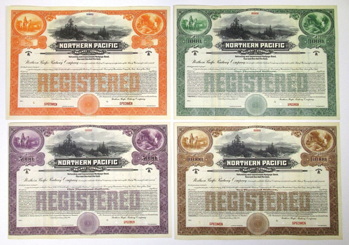 Wisconsin, 1914, Lot of 4 Specimen Bonds, Includes: $-Odd Registered 4 1/2% Series A Refunding and Improvement Mortgage Bond, Black with orange border; $1000 Registered 4 1/2% Series A Refunding and Improvement Mortgage Bond, Black with green border; $5000 Registered 4 1/2% Series A Refunding and Improvement Mortgage Bond, Black with purple border; $10,000 Registered 4 1/2% Series A Refunding and Improvement Mortgage Bond, Black with brown border. All have view of Mt. Hood at top center with Native people at top left corner and pioneers at top right, Specimen overprints, POCs, are in VF to XF condition, printed by ABNC. (4). Sold "AS IS" no returns accepted.