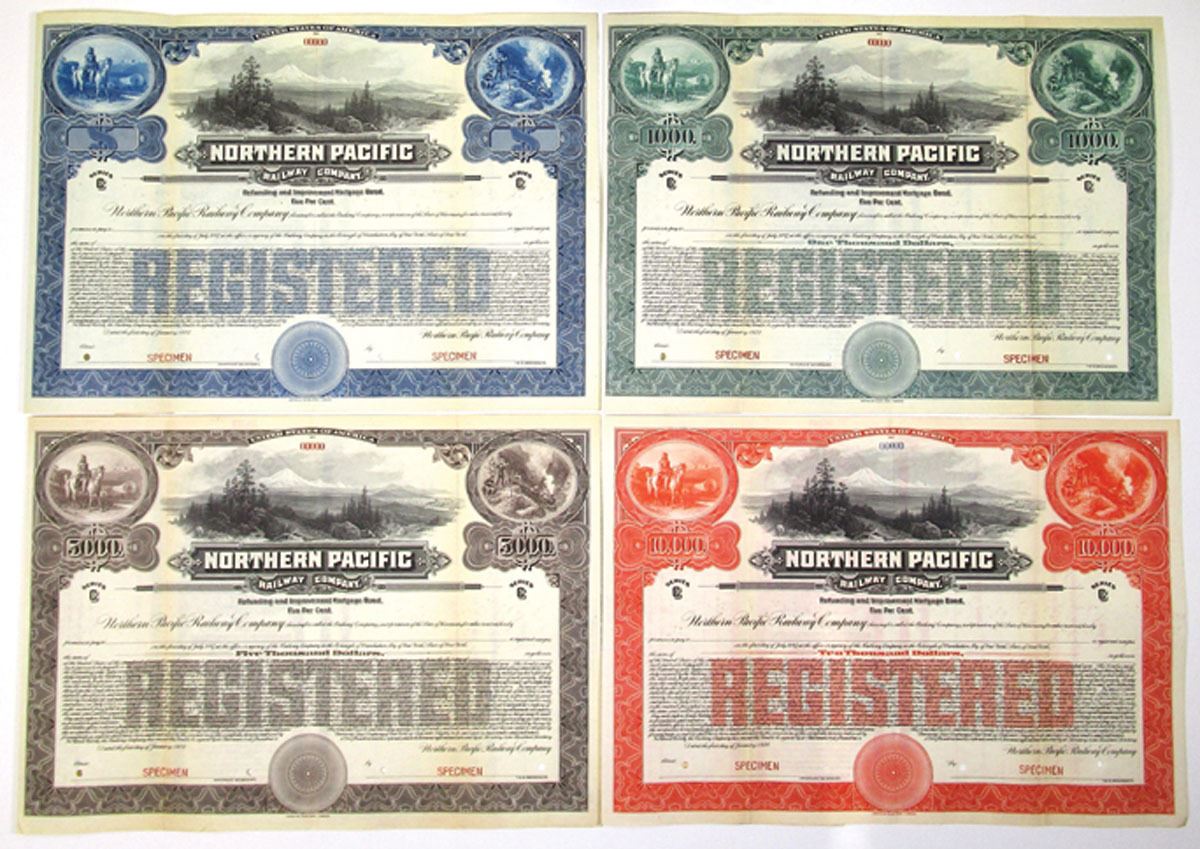 Wisconsin, 1922,Lot of 4 Registered Series C. Includes: $-Odd Registered 5% Series C Refunding and Improvement Mortgage Bond, Black with blue border; $1000 Registered 5% Series C Refunding and Improvement Mortgage Bond, Black with green border; $5000 Registered 5% Series C Refunding and Improvement Mortgage Bond, Black with brown border; $10,000 Registered 5% Series C Refunding and Improvement Mortgage Bond, Black with red/orange border. All have scenic view at top center with Native person in circular frame at left and pioneers watching train in frame at right, Specimen overprints, POCs, are in XF to AU condition, ABNC. (4). Sold "AS IS" no returns accepted.