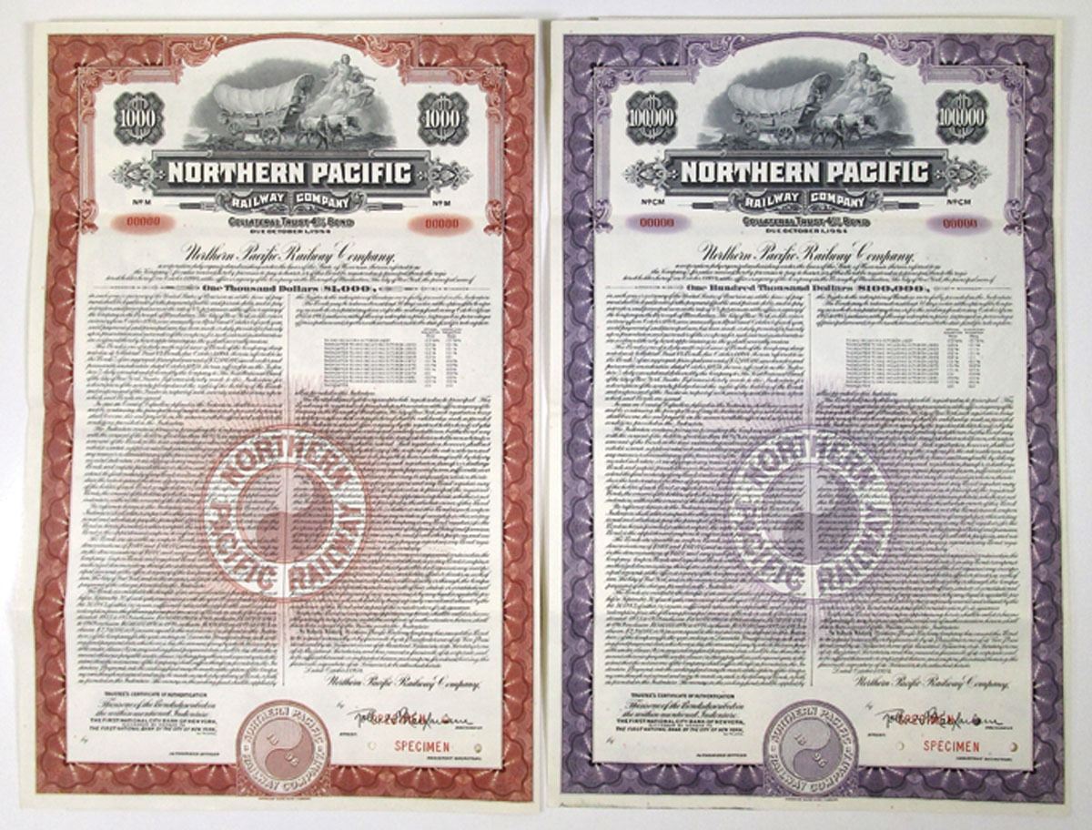 Wisconsin, 1954, Lot of 2 Specimen Bonds, Includes: $1000 4% Collateral Trust Coupon Bond, Black with brown border; $100,000 4% Collateral Trust Coupon Bond, Black with purple border. All have vignette of covered wagon following allegorical figures, Specimen overprints, POCs, are in VF to XF condition, printed by ABNC. Attractive railroad bond pair. The $100,000 denomination bond is only known as a specimen, no issued examples are known.