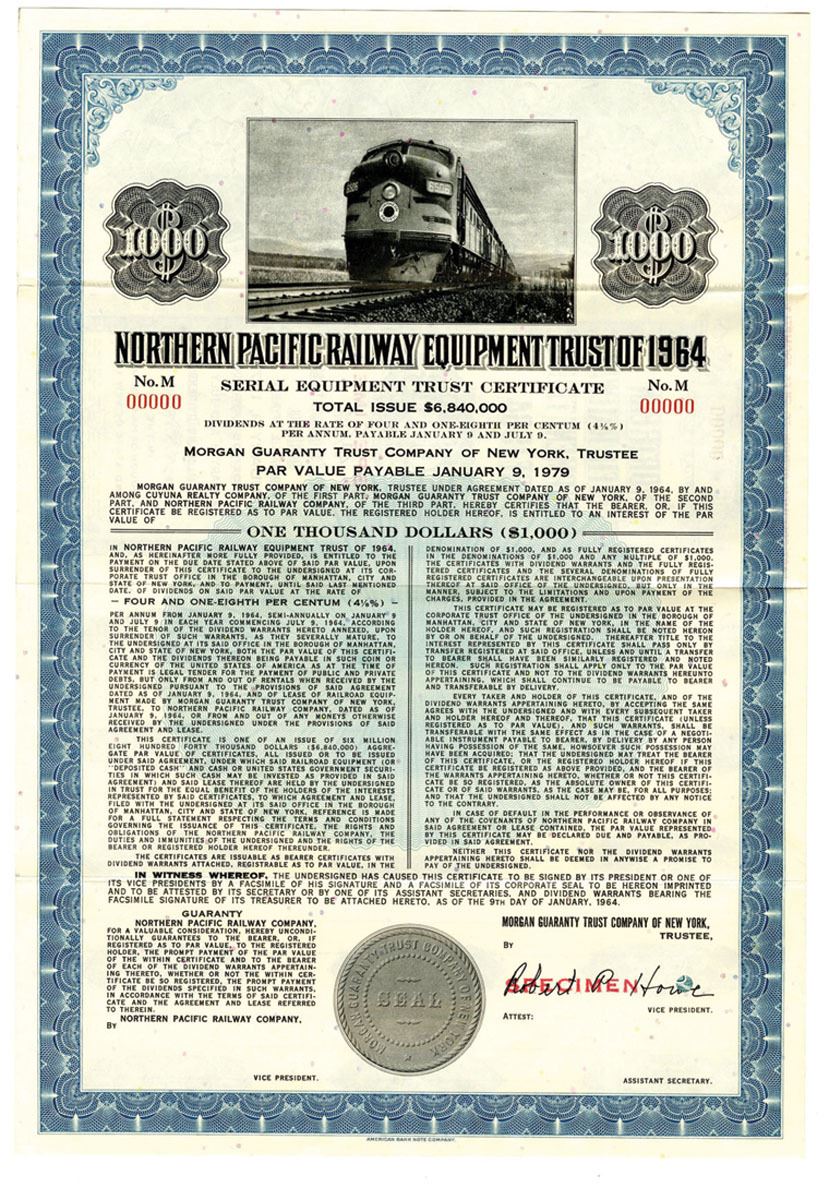 Serial Equipment Trust Certificate. The Northern Pacific Railway was a transcontinental railroad that operated across the northern tier of the western United States, from Minnesota to the Pacific Northwest. It was approved by Congress in 1864 and given nearly forty million acres of land grants, which it used to raise money in Europe for construction.