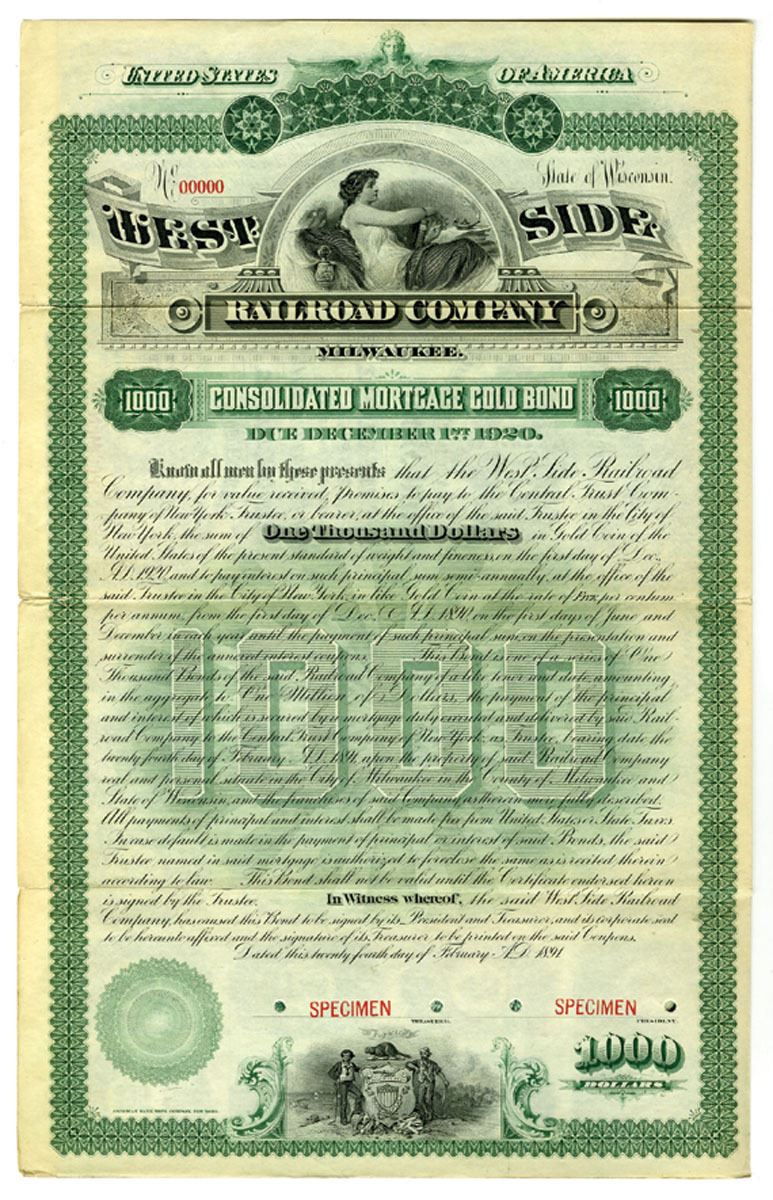 Milwaukee, Wisconsin, 1891. $1000 Specimen 5% Consolidated Mortgage Gold Coupon Bond, Black with green border and underprint, Allegorical women reclining in circular frame in middle of title at top with Seal of Wisconsin at bottom, Specimen overprints, POCs, VF to VF+ condition. ABNC. Listed railroad but no examples have been seen or recorded previously.