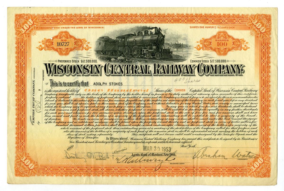 Wisconsin, 1953. 100 Shares Common Capital Stock I/U Certificate, Black print with orange border and underprint, Train vignette at top center, S/N 10727, VF to XF condition with staples holes. Franklin-Lee BNC.