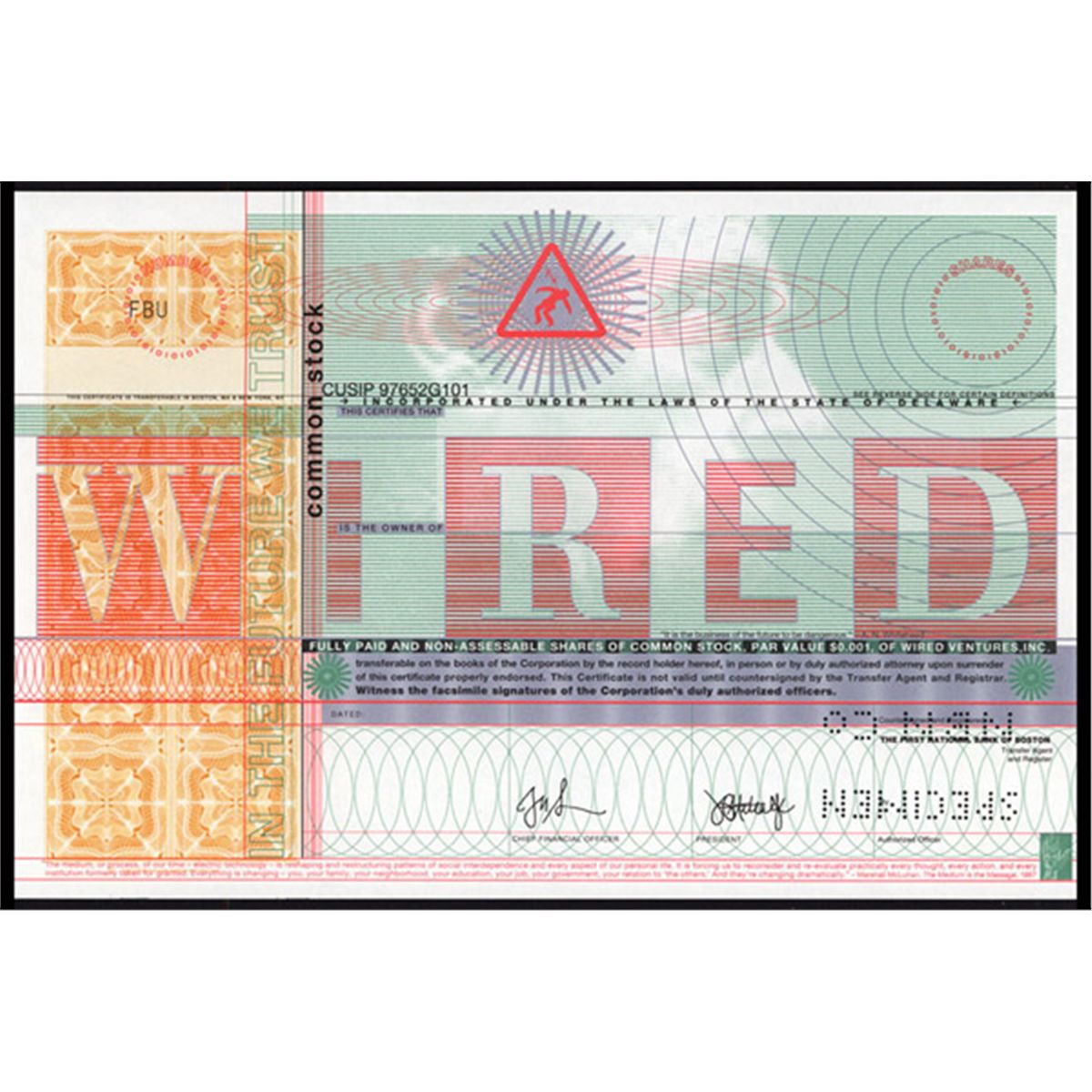 San Francisco, California, ND, (ca.1993), Odd Shares, Specimen stock, Extremely attractive and colorful stock certificate from this well known internet age magazine. The magazine and website reported on how new and developing technology affects culture, the economy, and politics. There are interesting quotes on the front of the certificate such as “It is the business of the future to be dangerous “ by A. N. Whitehead. Pin pinch specimen overprint, XF condition, Northern BNC. Very cool digital design over engraved end panel on left. Rare certificate.