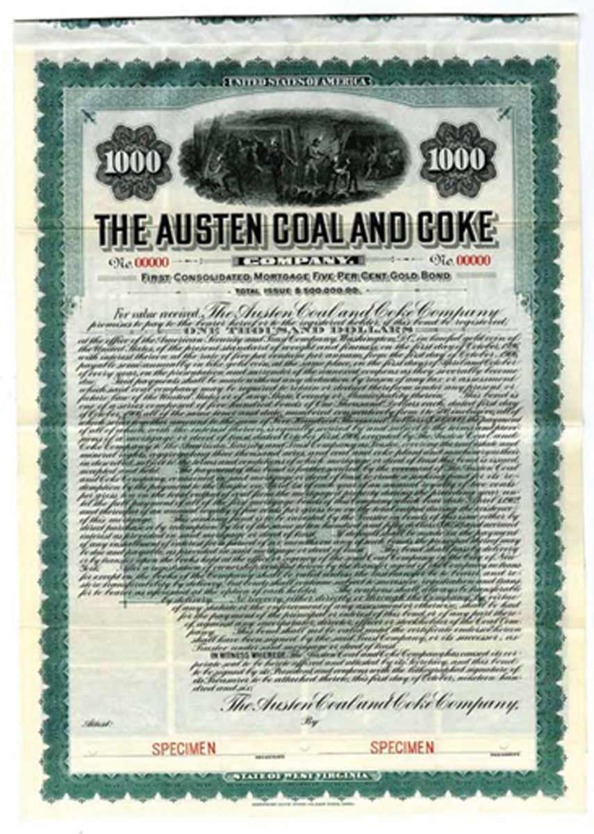 West Virginia. 1906. $1000 Specimen 5% 1st Consolidated Mortgage Gold Coupon Bond, Black print on green border and under tint, Men in mine at top, Specimen overprints and POC's, VF-XF condition, ABNC.