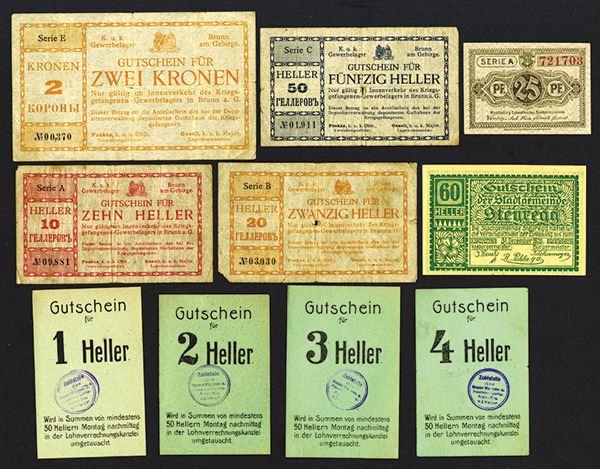 Austria. 1920-1922 Brunn 10, 20, 50, Heller, 2 Kronen. Very Good or so. Wage withholding coupons. 1, 2, 3, 4 Heller with hand stamp. Mechlenburg 25 pf. And Steyregg 60 Heller. Generally Extremely Fine. 10 pieces.
