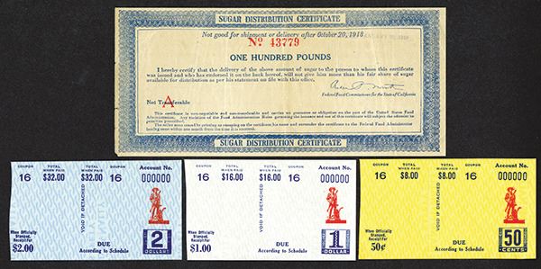 U.S.. Sugar Distribution Certificate, dated 10.20.1918 with 1.20.1919 hand stamp correction. Certificate for 100 Pounds of Sugar. .50, $1, 2. Coupons specimens. With minuteman statue. First is Fine, others Uncirculated. 4 pieces.