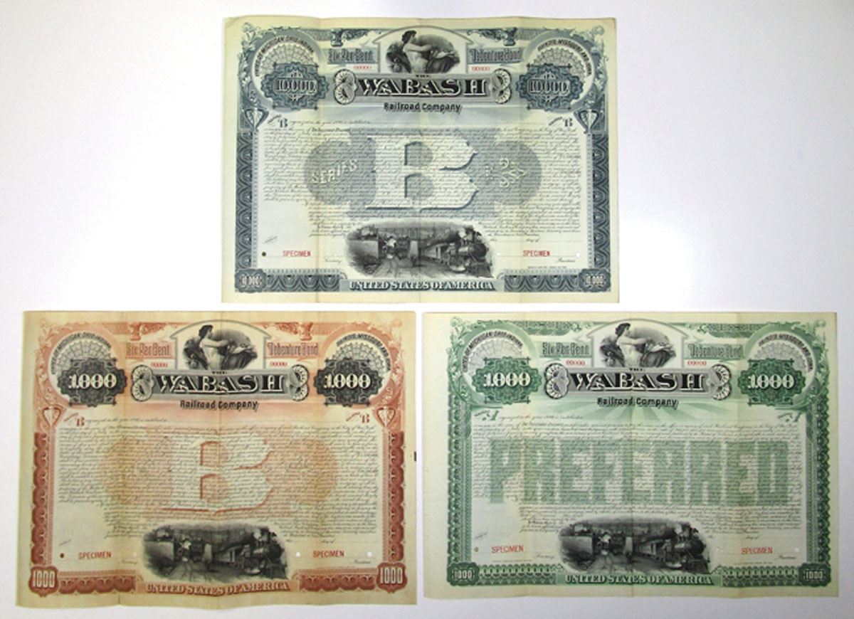 MI, OH, IN, IL, MO, IA, 1889 (1899 to 1905) Lot of 3 Specimen Bonds, Includes: 1905 $1000 Registered Series A 6% Debenture Bond, Black with green border; 1899 $1000 Registered 6% Series B Debenture Bond, Black with brown border; 1900 $10,000 Registered 6% Series B Debenture Bond, Black with blue border. All have allegorical woman reclining at top, Men in railyard with trains at bottom, Specimen overprints, POCs, are in Fine with archival reinforcement at fold lines to VF condition, printed by ABNC. (3). Sold "AS IS" no returns accepted.