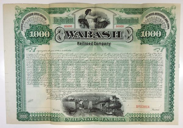 Michigan, Ohio, Indiana, Illinois, Missouri and Iowa, 18xx (1889), $1000 Specimen 6% Registered Debenture Bond, Black on green border and underprint, Reclined lady in center, two moving locomotives under bridge bottom center, VF condition, ABNC.