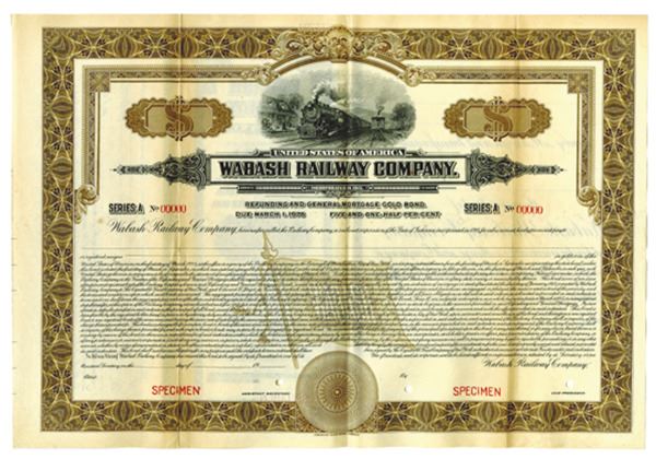Indiana. $-Odd Specimen 5 1/2% Series A Registered Refunding and General Mortgage Gold Coupon Bond, Black print on brown border and under tint on horizontal format, Locomotives at top passing station, Specimen overprints and POC's, Fine-VF condition with splitting along fold lines condition, ABNC.