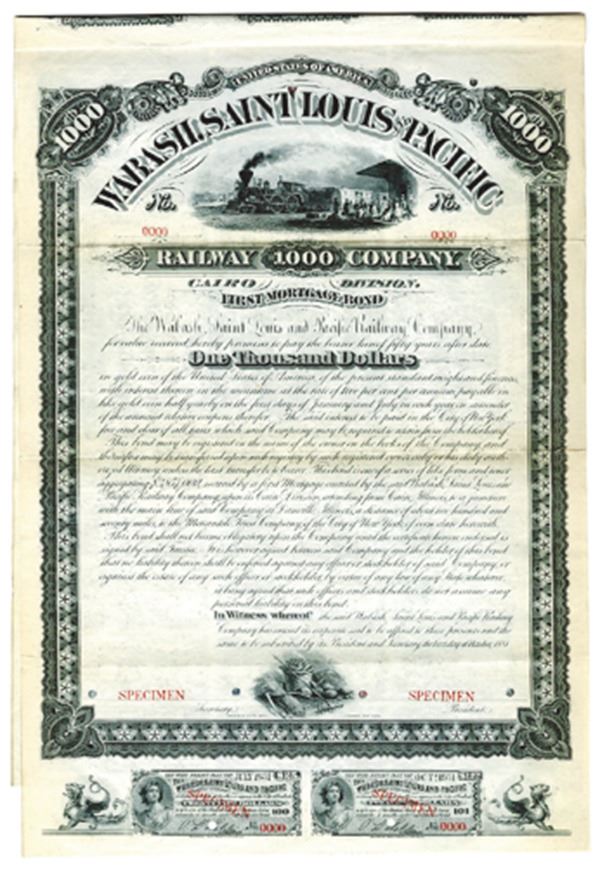 Ohio, Indiana, Illinois, Missouri, Montana, & Iowa. $1000 Specimen 5% Cairo Division 1st Mortgage Coupon Bond, Black print on black border, Locomotive by station at top, Specimen overprints and POC's, Fine-VF condition with toning over certificate, ABNC. Rare with only 3 examples found in the ABN Archives in 2002.
