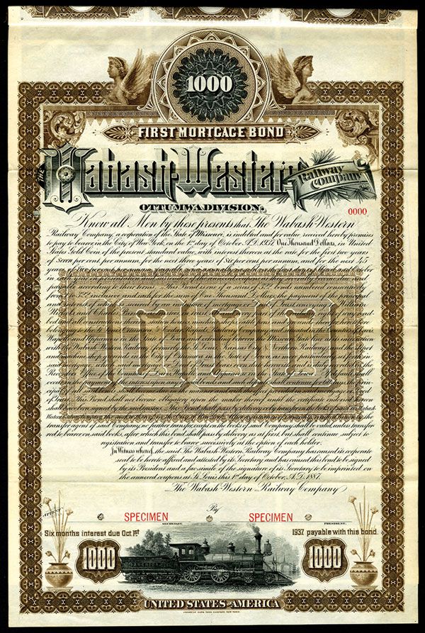 1887. $1000 6% Specimen Bond with Coupons. Ottumwa Division. Black print with brown border and underprint. Moving locomotive l-r bottom center. POC's and red SPECIMEN overprints. VF condition. ABNC. Unlisted railroad in Cox.