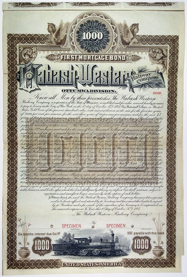 Missouri. 1887, $1000 Specimen Ottumwa Division 7% for two years, 6% for three years, First Mortgage Coupon Bond, Black text with brown border and underprint, Train passing by a harbor at bottom. Red specimen overprints, "0000" serial number, POC's, VF condition, ABNC, Rare and only known as a specimen in Cox.