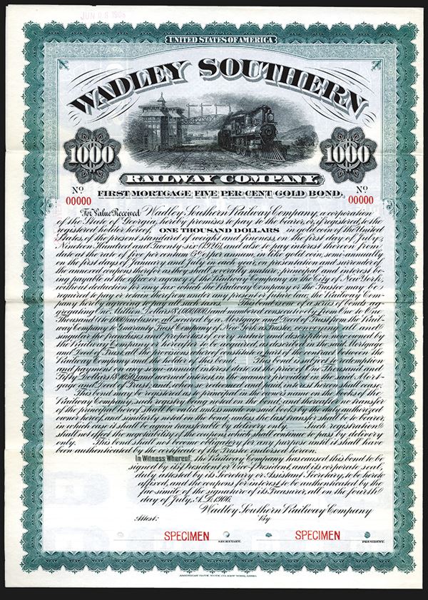 Georgia, 1906, $1000 1st Mortgage 5% Specimen Bond, Black printing with green border and underprint, Moving locomotive passing under signal tower top center, POC's and red SPECIMEN overprints, VF-XF condition, ABNC. Unlisted railroad and bond in Cox.