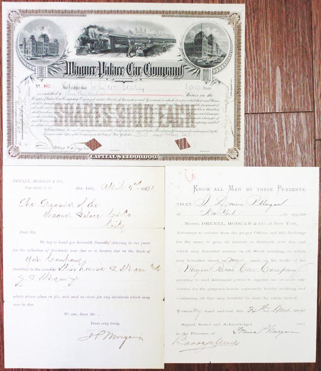 New York. Lot includes 3 pieces: Wagner Palace Car Co. 1888, 100 Shares I/C Stock Certificate, S/N 462, Black text with brown border and underprint, LaSalle Street Station at top left, Train with long line of cars passing by group of men at center, and Grand Central Station at top right. Cut out signatures at bottom, VF condition, ABNC. Issued to John W. Sterling (May 12, 1844 Ð July 5, 1918), a founding partner of Shearman & Sterling LLP and major benefactor to Yale University. Signed by William Seward Webb as president. William Seward Webb (January 31, 1851 Ð October 29, 1926) was a businessman, and inspector general of the Vermont militia with the rank of colonel. He was a founder and former president of the Sons of the American Revolution. In 1883, Webster Wagner, the president of the Wagner Palace Car Company, was crushed between two of his own railroad cars. Vanderbilt owned a controlling interest in the company, and asked his new son-in-law to take over the firm. William Seward invited his brother H. Walter Webb to join him, which started them both on careers in the railroad business. The Wagner Palace Car Company was subsequently merged with the Pullman Company. Webb later became president of the Fulton Chain Railway Company, the Fulton Navigation Company, and the Raquette Lake Transportation Company. He was the builder and president of the Mohawk and Malone Railway. His railroads were instrumental in opening the Adirondacks to the tourism rush of the mid- to late 19th century; Lot also includes an 1891 document from Louisa P. Morgan appointing Drexel, Morgan & Co. of New York to collect dividends and interest in her name from the Wagner Palace Car Company; Final piece is also an 1891 document, addressed to the Treasurer of the Wagner Palace Car Co., stating that the company should send dividends and interest to the powers of attorney (Drexel, Morgan & Co.) for Miss Louisa P. Morgan and J.P. Morgan Jr., both children of J.P. Morgan. This piece is also signed by J.P. Morgan Jr. at the bottom right. John Pierpont Morgan (April 17, 1837 Ð March 31, 1913) was an American financier and banker who dominated corporate finance on Wall Street throughout the Gilded Age. As the head of the banking firm that ultimately became known as J.P. Morgan and Co., he was a driving force behind the wave of industrial consolidation in the United States spanning the late 19th and early 20th centuries. Over the course of his career on Wall Street, J.P. Morgan spearheaded the formation of several prominent multinational corporations including U.S. Steel, International Harvester and General Electric. He and his partners also held controlling interests in numerous other American businesses including AT&T, Western Union and 24 railroads. Due to his financial dominance, Morgan came to wield enormous influence over the nation's lawmakers and finances. During the Panic of 1907, he organized a coalition of financiers that saved the American economy from collapse. As the Progressive Era's leading financier, J.P. Morgan's dedication to efficiency and modernization helped transform the shape of the American economy. Adrian Wooldridge characterized Morgan as America's "greatest banker". Morgan died in Rome, Italy, in his sleep in 1913 at the age of 75, leaving his fortune and business to his son, John Pierpont Morgan Jr, mentioned in this piece. Fascinating trio of documents, related to one of the most prolific American businessmen in history, as well as his family and companies. (3) (John E. Herzog Collection)