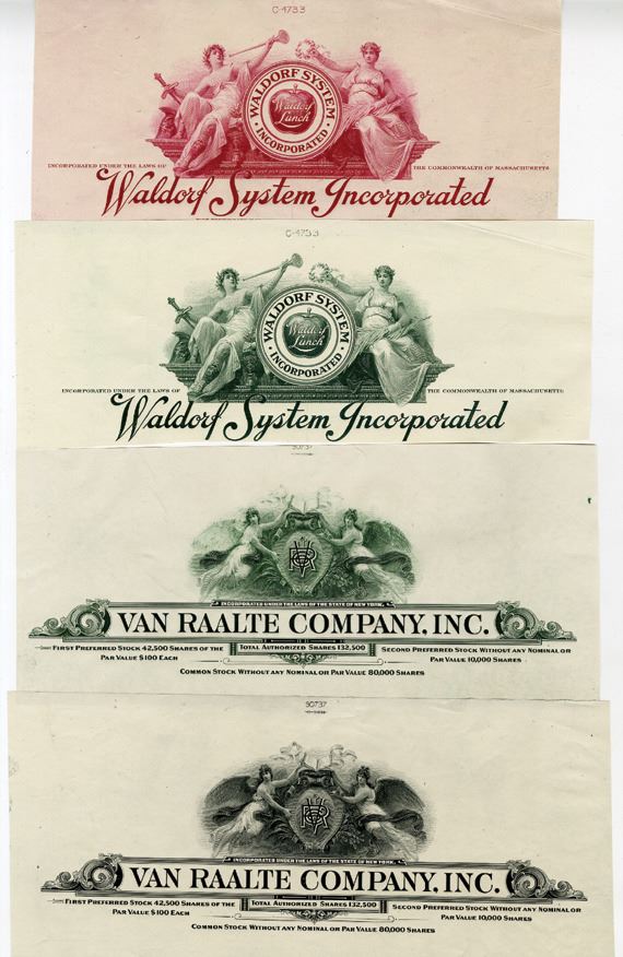 Waldorf System Inc., & Van Raalte Co. Inc., Lot of 4 Proof Bond Titles 2 of each company in different colors., AU-Unc. condition. (4). Sold "AS IS" no returns accepted. These are authentic proof vignettes from the American Bank Note Archives which were dispersed through auctions and private sales between 1988 and 2005. They are extremely rare intaglio proof vignette printed on India paper from the original plates in very limited quantities by ABNC. The vignettes were used for U.S. and Worldwide Obsolete banknotes, stock and bond certificates, checks, drafts and other fiscal issues. ABNC printed extra vignette proofs for use in future designs as well as for samples for their records. Most of them are known with very few impressions as vignettes (between 1 and 20 total, mostly in the 5 or 10 total printed category). Predecessor printers such as Rawdon, Wright, Hatch & Co.; National Bank Note Co.; Continental Bank Note Co., and others are represented. All were acquired by ABNC over the years and kept in their archives that were stored by ABN. This is a rare opportunity to collect a rare historical engraving by this amazing company.