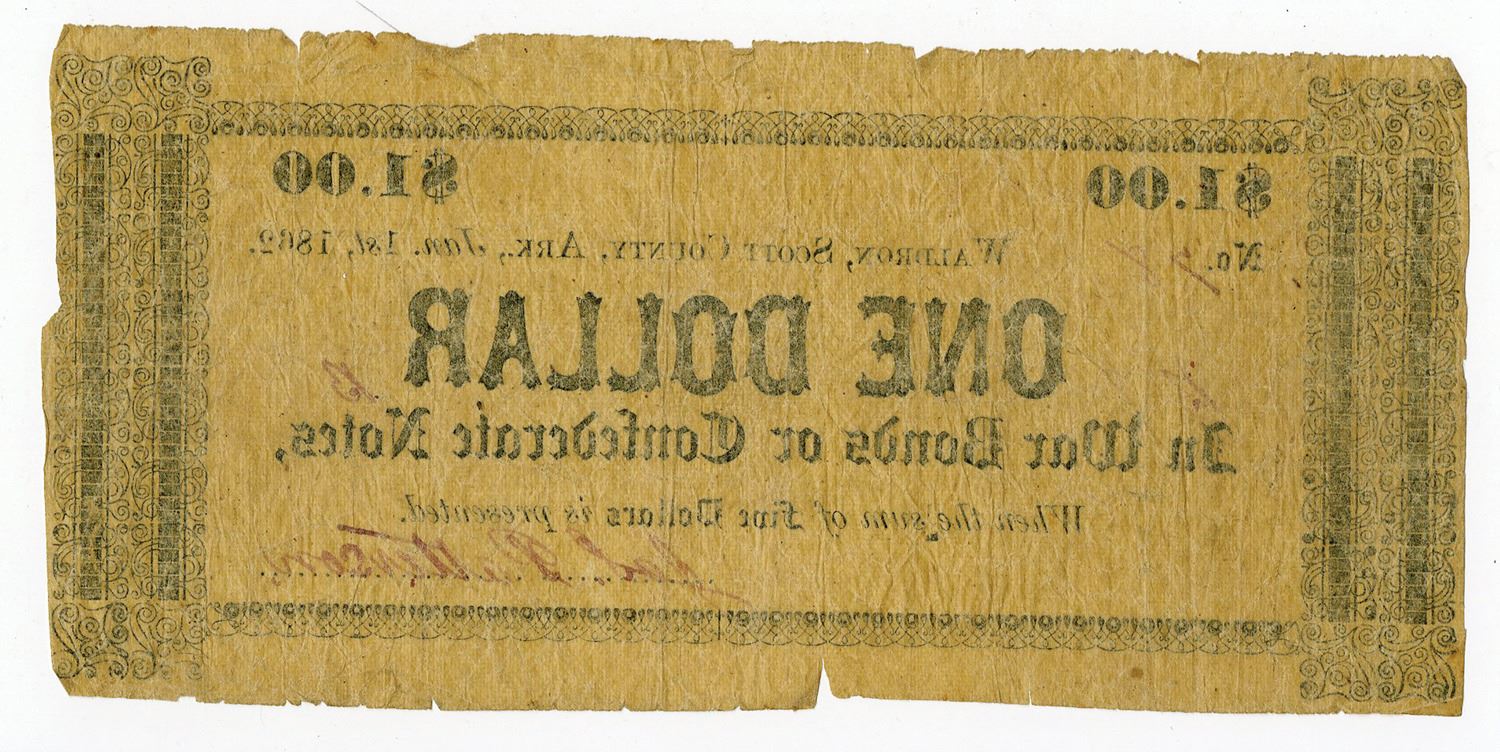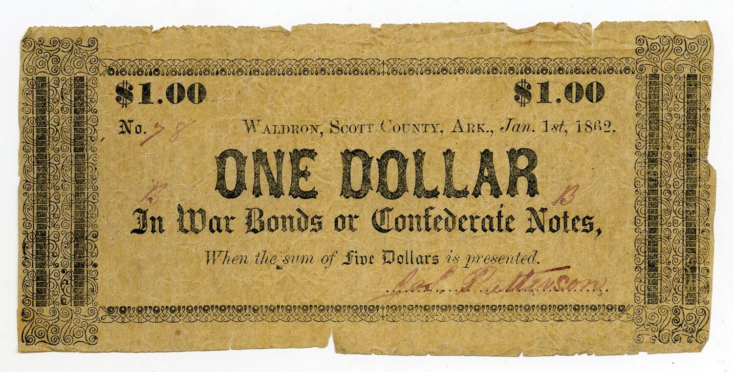 Waldron, Scott County, Arkansas. January 1, 1862, James Patterson. $1, (Rothert 671-2), Issued obsolete scrip note, Dated January 1st, 1862, Black text with "Due to Bearer" has been removed in the middle, also with text "In War Bonds or Confederate Notes", black border, blank back, Signature at bottom right in red, S/N 78, Fine condition with some very slight rough margins. Rarity 7 in Rothert. Only a single $2 note from this issue was seen at auction previously 6 years ago.