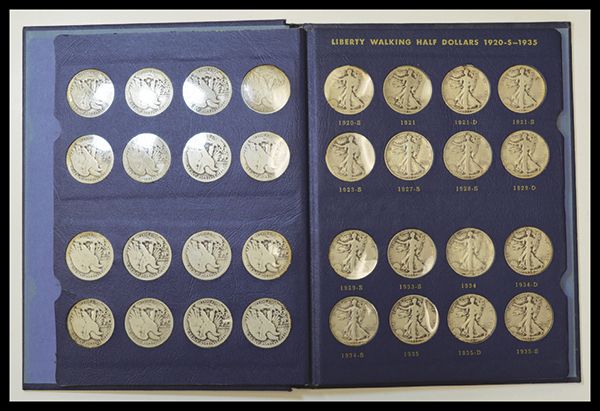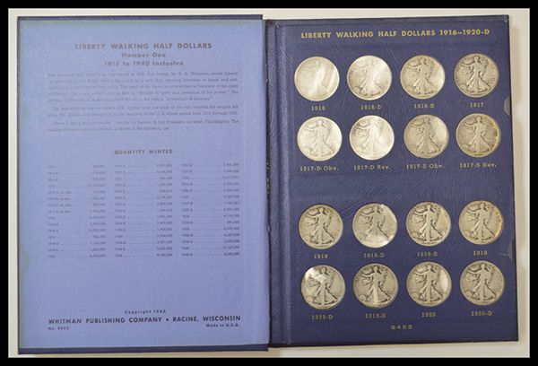 Walking Liberty Half Dollar Collection in Blue Album Complete from 1916-1945. The 1916 is VF-EF, 1916-S Good, 1921 Good, 1921-D VG-F. The other early dates are mostly Good, with a few only About Good. 1927-S-1940-S are mostly Fine to Very Fine. [45], weight approximately 2 lbs.