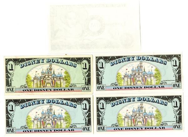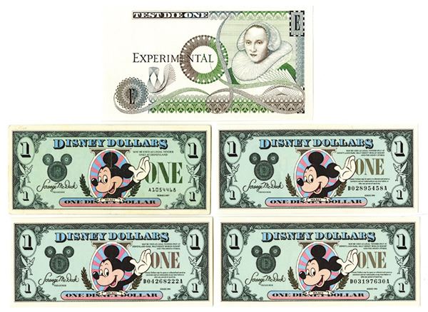Walt Disney, group of 4 issued 1 Disney Dollar notes featuring Mickey Mouse. Also included is a Bank of England uniface experimental test note with denomination "Test Die One". Sold as is.