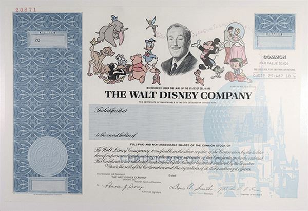 Delaware. Odd Shares Specimen Stock Certificate, Black text on white & blue background with illustrations of Walt Disney Park buildings at lower right corner, and colorful Disney characters surround a portrait of Walt Disney at top. Pin-punch Specimen, VF condition. Popular specimen from an iconic brand. Michael Eisner Facsimile signature.