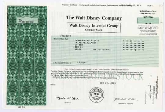 Delaware, 2000. Walt Disney Company, "Walt Disney Internet Group", 1 Share Common Stock I/U Certificate, Black on green border and underprint, Low Serial Number "ZQ1000000236, Company title at top, AU to Uncirculated condition, SC-USBNC. Walt Disney Internet Group provides Internet services and software products. The Company produces GO Network, as well as an Internet service. Walt Disney's service includes gateways that combine branded content from media such as ABC News and ESPN Sports, search and navigation with directories of relevant information sources and content sites, and community applications.