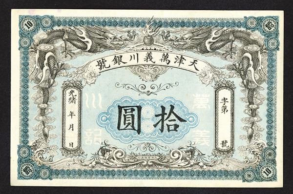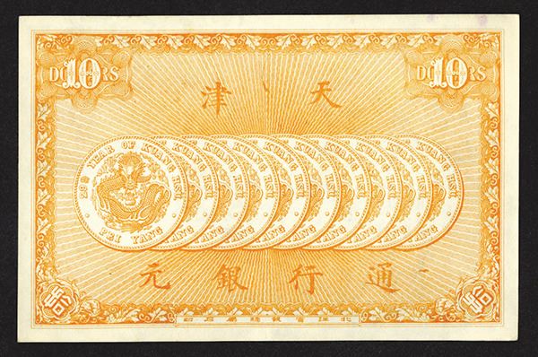 Tientsin, China, 1905, $10, P-Unlisted (S/M#13-13r), Remainder, Black and blue on light blue underprint with facing dragons at top, back in orange with 10 "29th Year of Kuang His - Pei Yang" silver dollars, Choice AU, Attractive and rare note in any grade. PYOG, printer. (The Silicon Valley Collection)