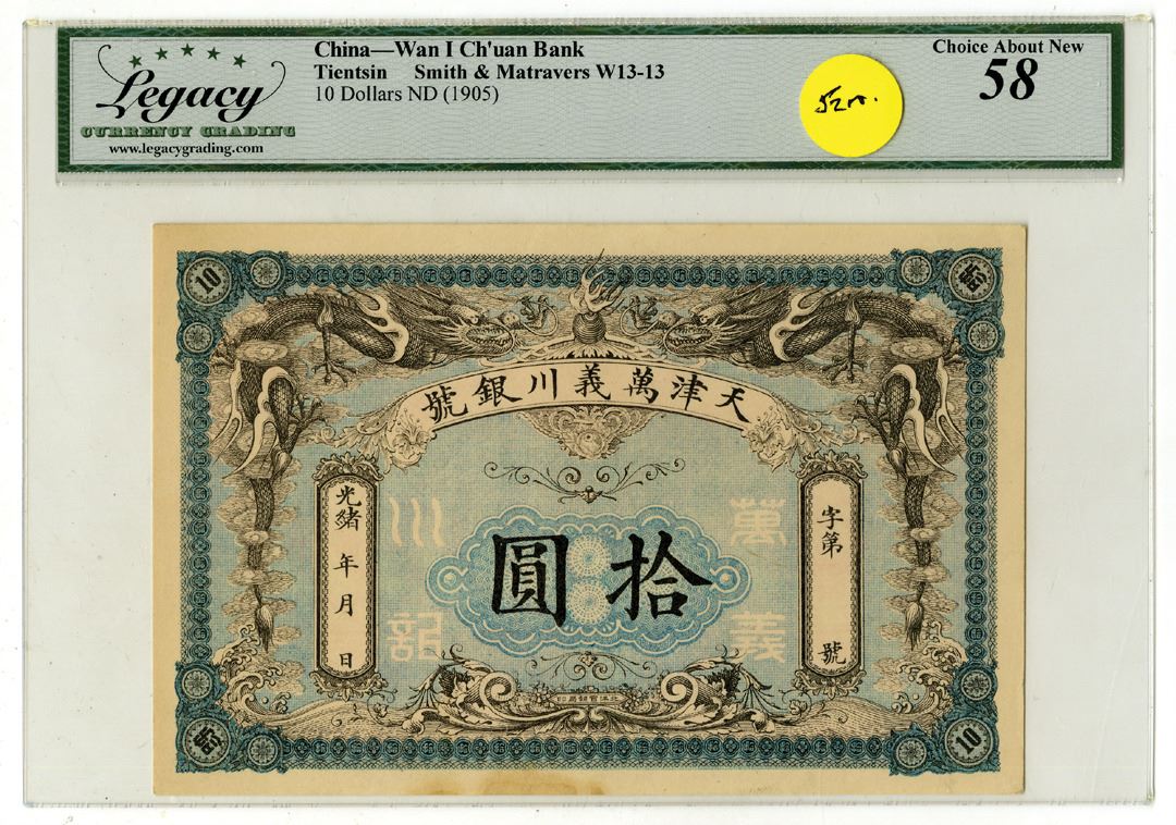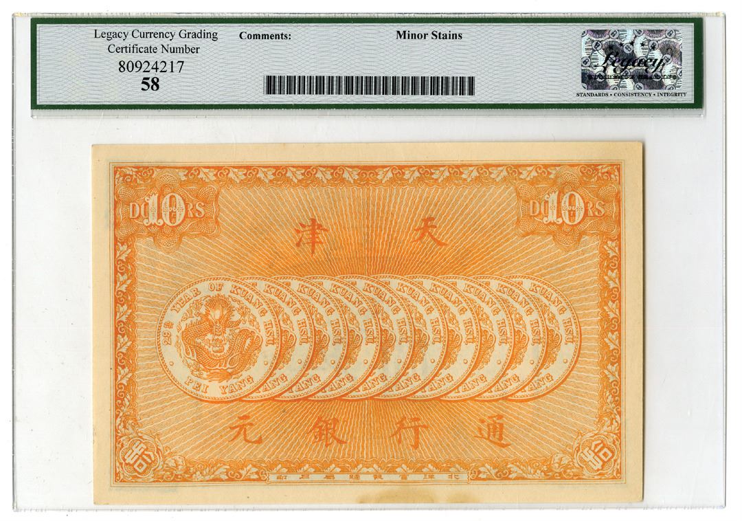 China, ND (1905), 10 Dollars, P-Unlisted, S/M#W13-13, Remainder banknote, Blue and black with facing dragons at top, back orange with 10 overlapped 10 Dollar "Pei Yang - 29th Year of Kuan Hsu" Empire coins, Legacy graded Choice About New 58, Rare and very attractive coin note. AIA sold a similar example, but a 2 Dollar note from this bank in 2016 for $2400.