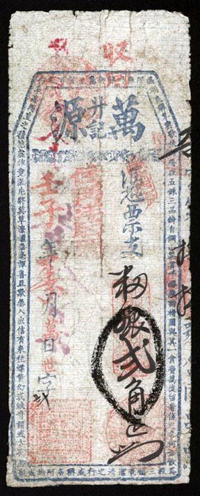 1912. 20 cents, P-Unlisted. Issued note, blue and black Chinese text with red overprints on front, back with red text. Appears VG to VG+. Scarce private banknote that is seldom seen.