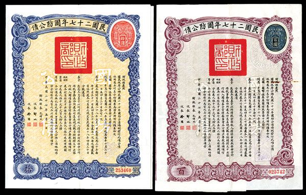 China, Lot of 2 bonds, includes 10 Yuan, blue, and 100 Yuan, purple bonds, both in VF-XF, Uncancelled, one with 50 and one with 49 coupons.