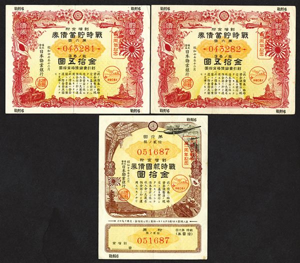 Japan. Schwan/Boling 318 (2); 374; Second edition pgs. 549/552. First Anniversary of GEAW at upper right. Flag, aircraft, tank and ship border design. All with center fold, slight stain. Choice Very Fine. 3 pieces.