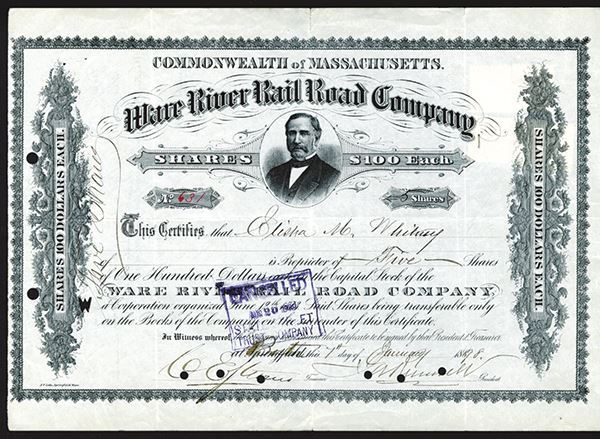 MA, 1898, 5 Shares of Stock, Ware River Railroad Co., Issued and Cancelled Stock Certificate. VF