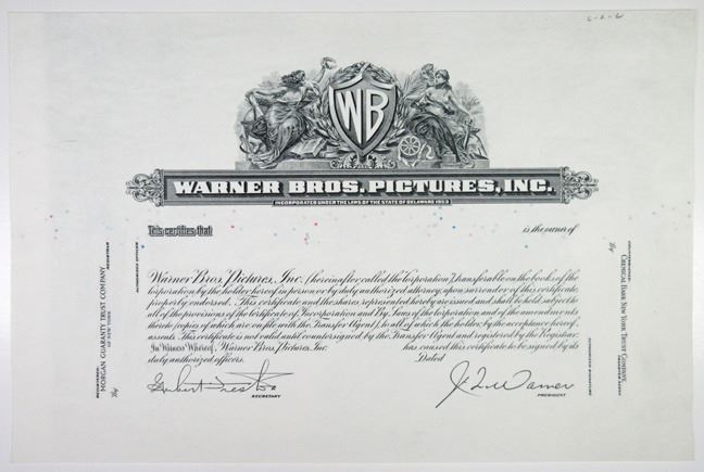 Delaware. Progress proof stock certificate. Vignette featuring WB logo flanked by allegorical women with reel of film and book (of scripts). Black ink on white paper. No frame or numbers. Pencil annotations at top front and back. ABNC.